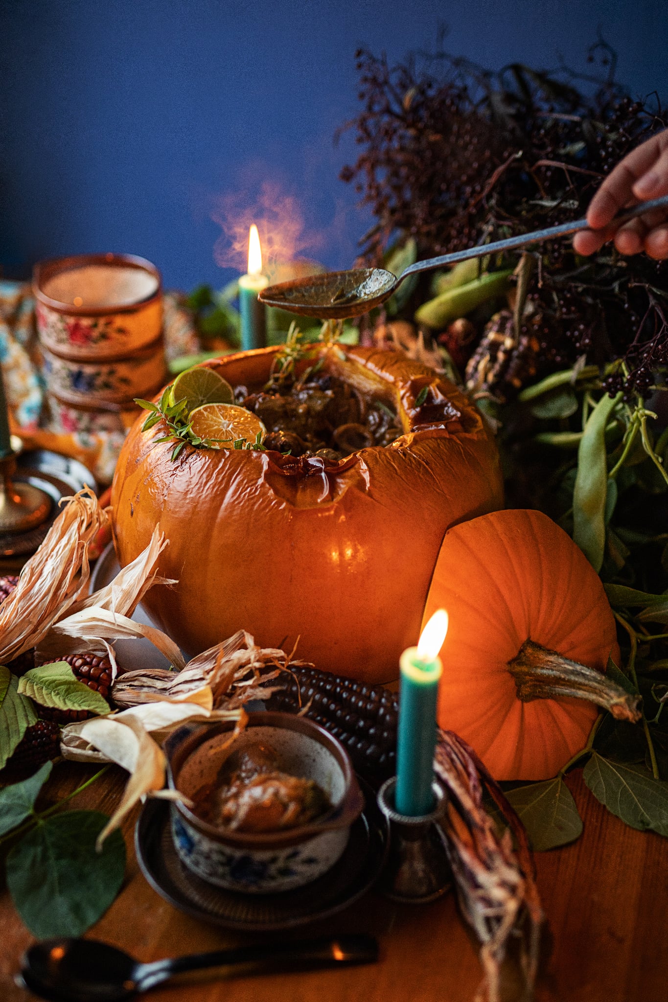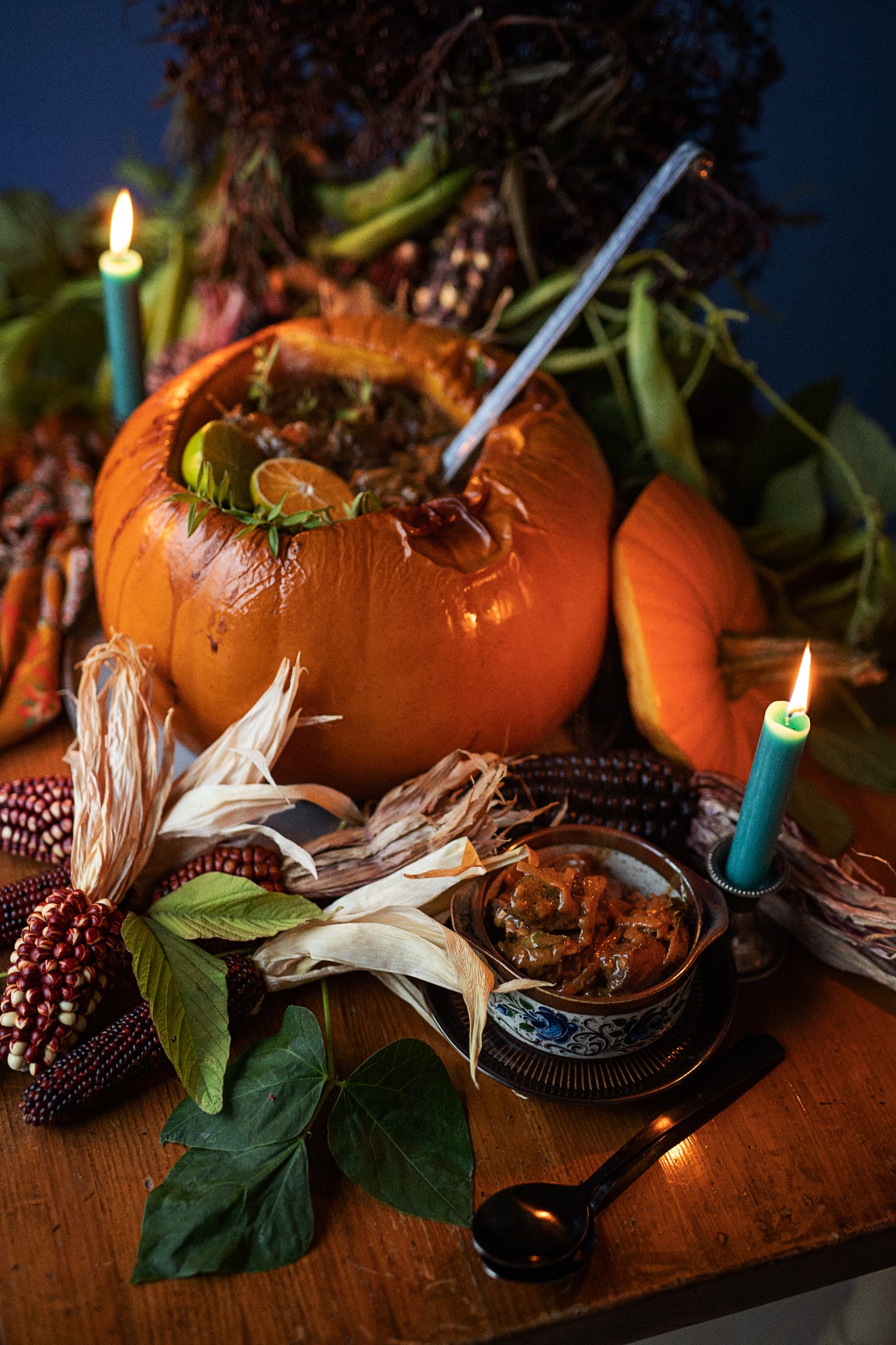 (kepta vištiena su aromatingu kokosų ir sojos padažu moliūgo viduje)